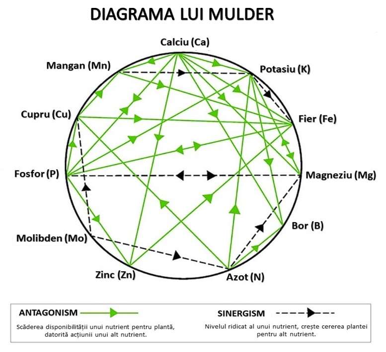 Pentru a înțelege mai bine relațiile de sinergism, complementaritate și antagonism, este suficient să privim cu atenție diagrama lui Mulder și să analizăm interacțiunile între elementele nutritive principale pentru plante.